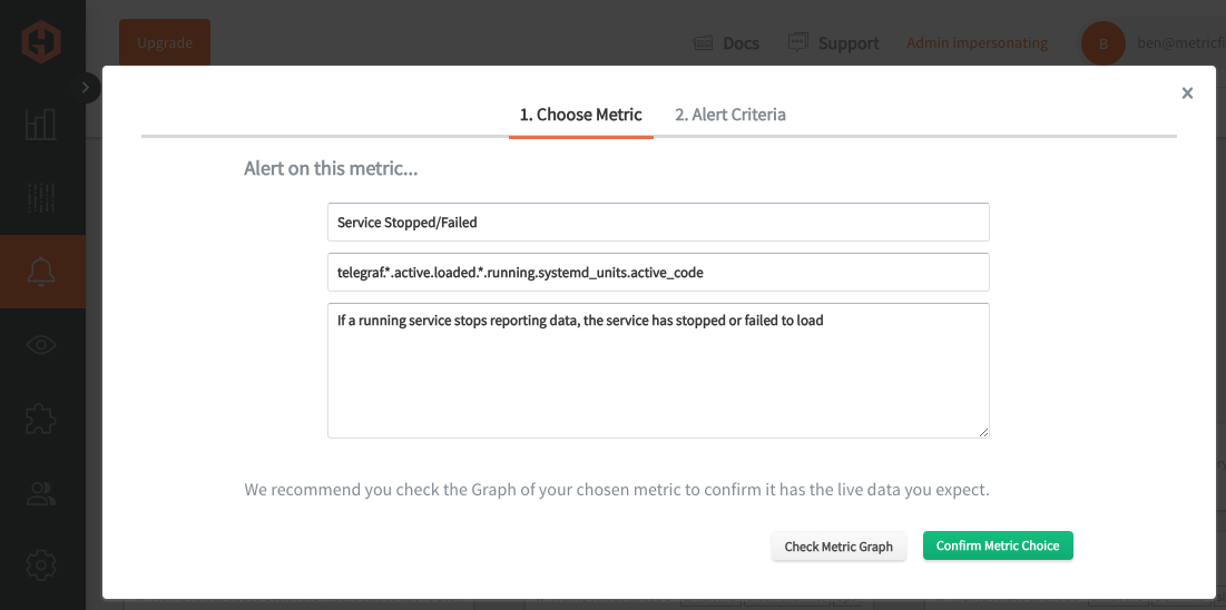 Then, select the Alert Criteria tab to set a threshold and select a notification channel. The default notification channel will be the email you used to sign up for the Hosted Graphite account. Still, you can easily configure channels for Slack, PagerDuty, Microsoft Teams, OpsGenie, custom webhooks and more. See the Hosted Graphite docs for more details on notification channels: